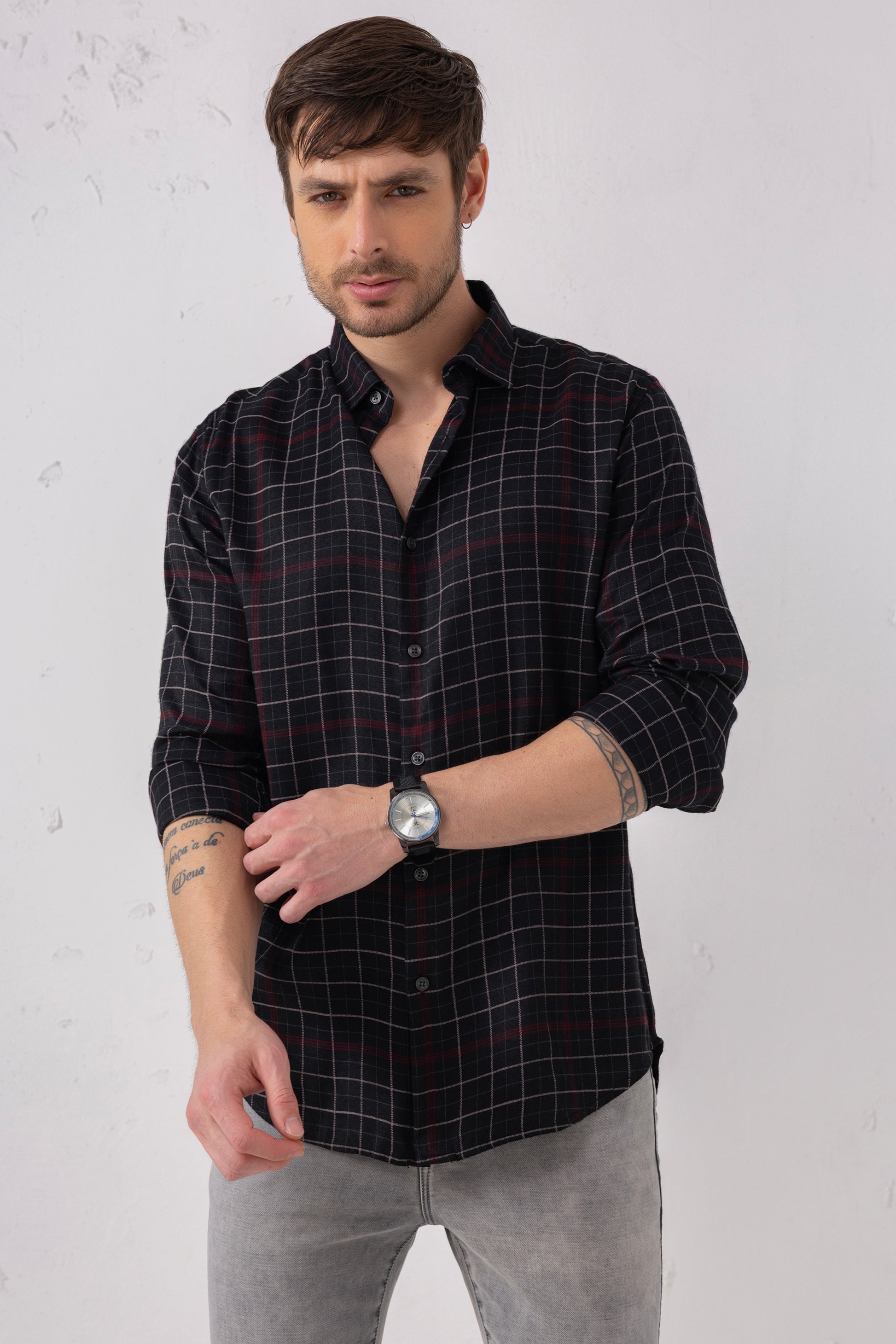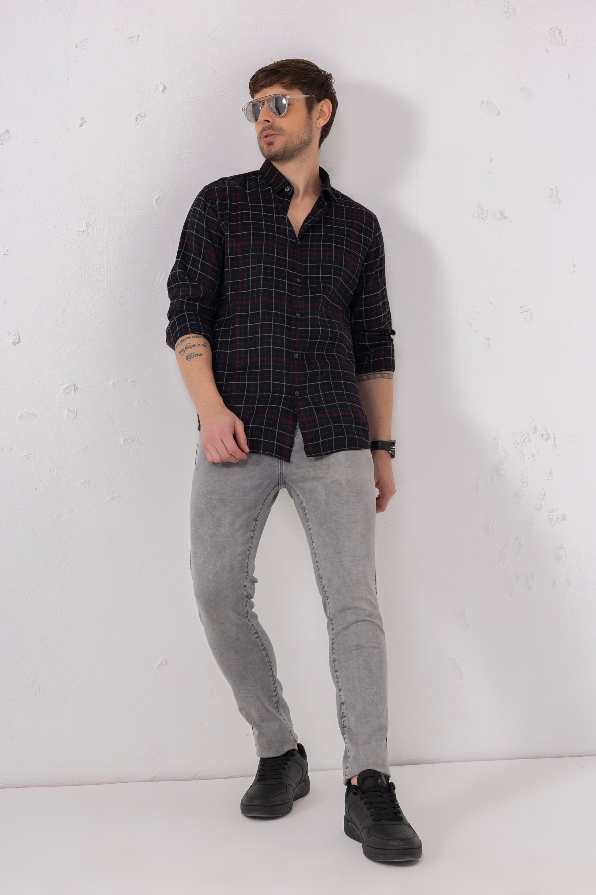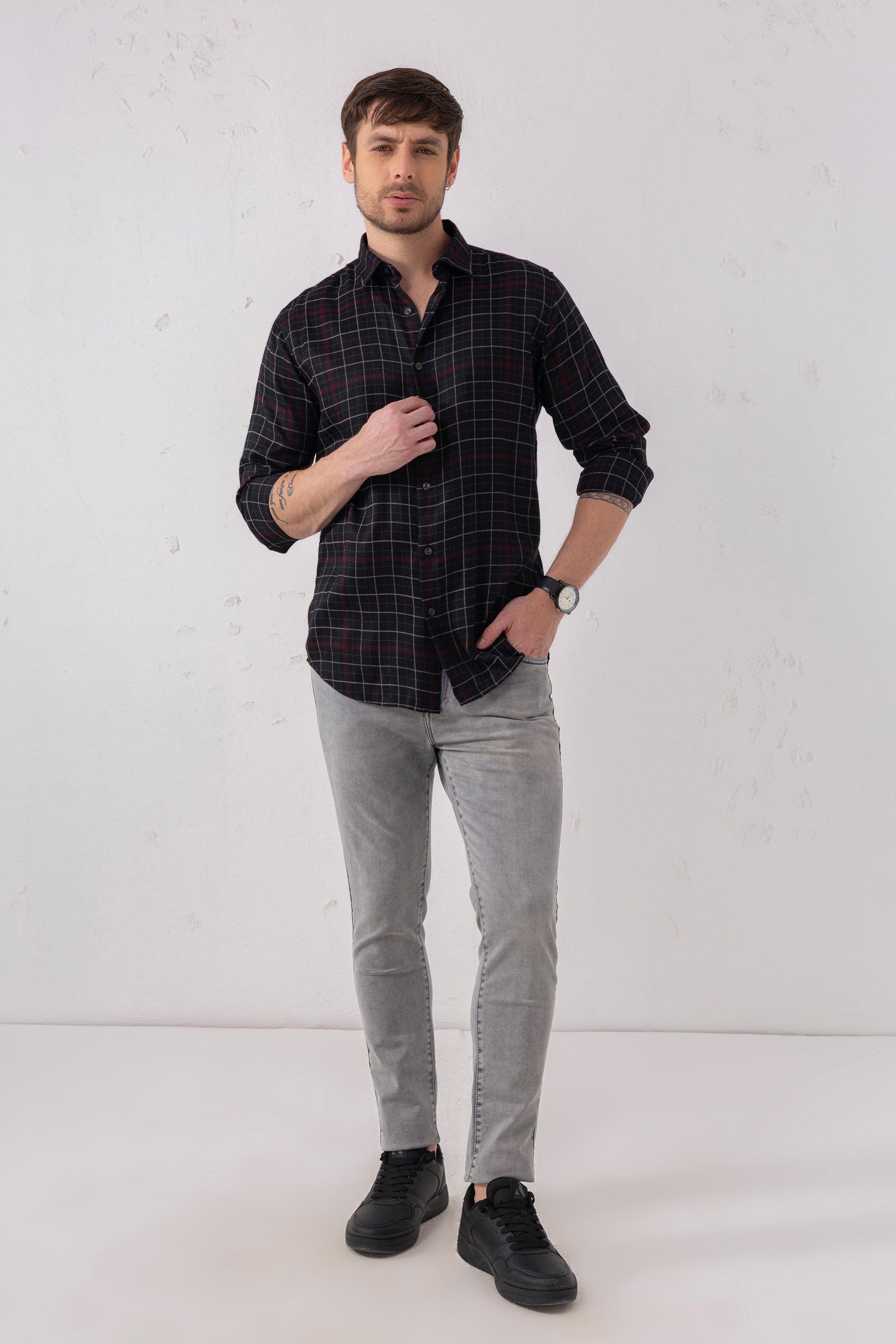 Pair it with solid chinos or dark denim to let the grid pattern stand out. Wear buttoned up for a smart-casual aesthetic or layered over a white tee for a laid-back street style look. Throw on white sneakers or leather loafers to complete your outfit depending on the occasion. From weekday to weekend, this shirt adapts effortlessly to your rhythm.