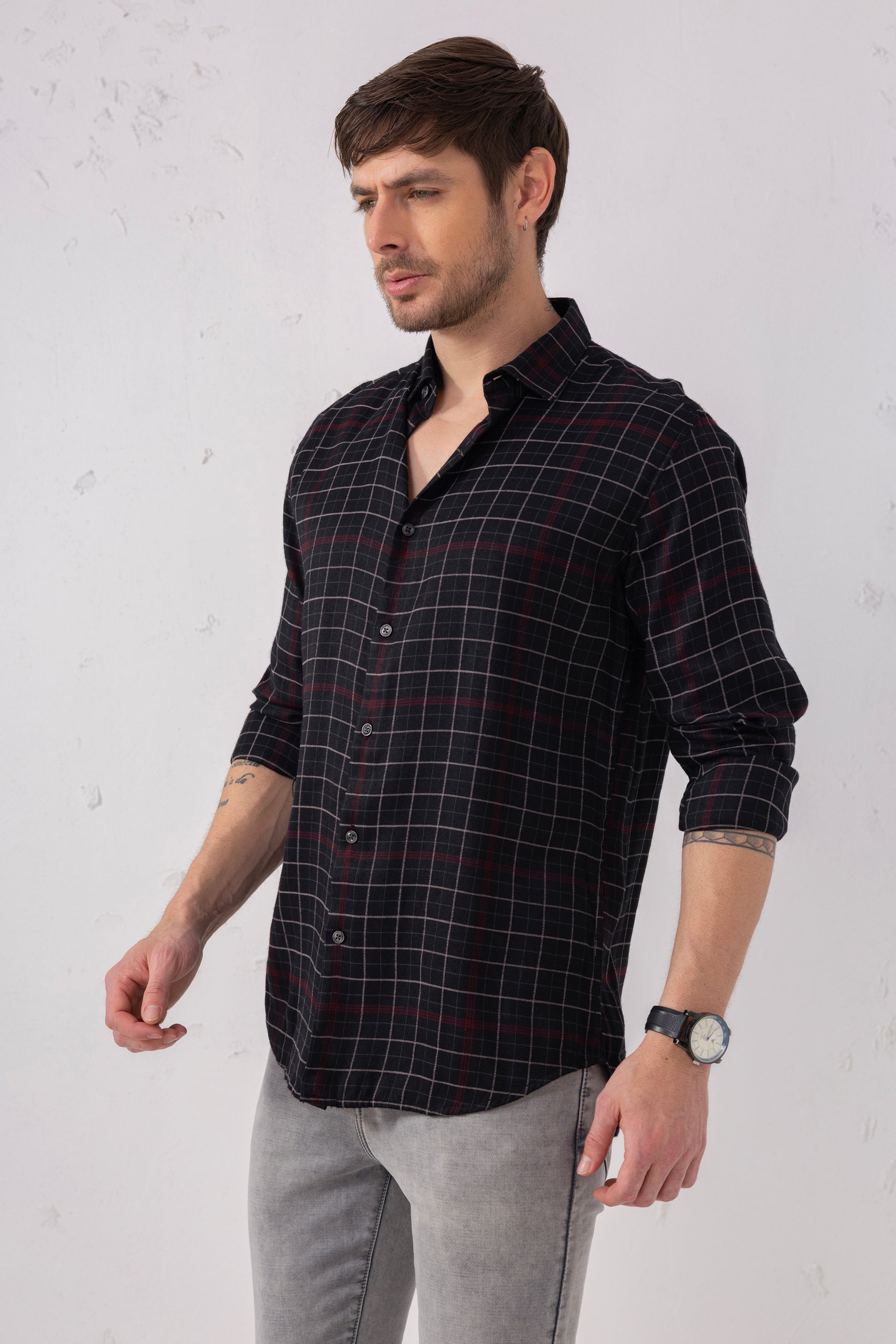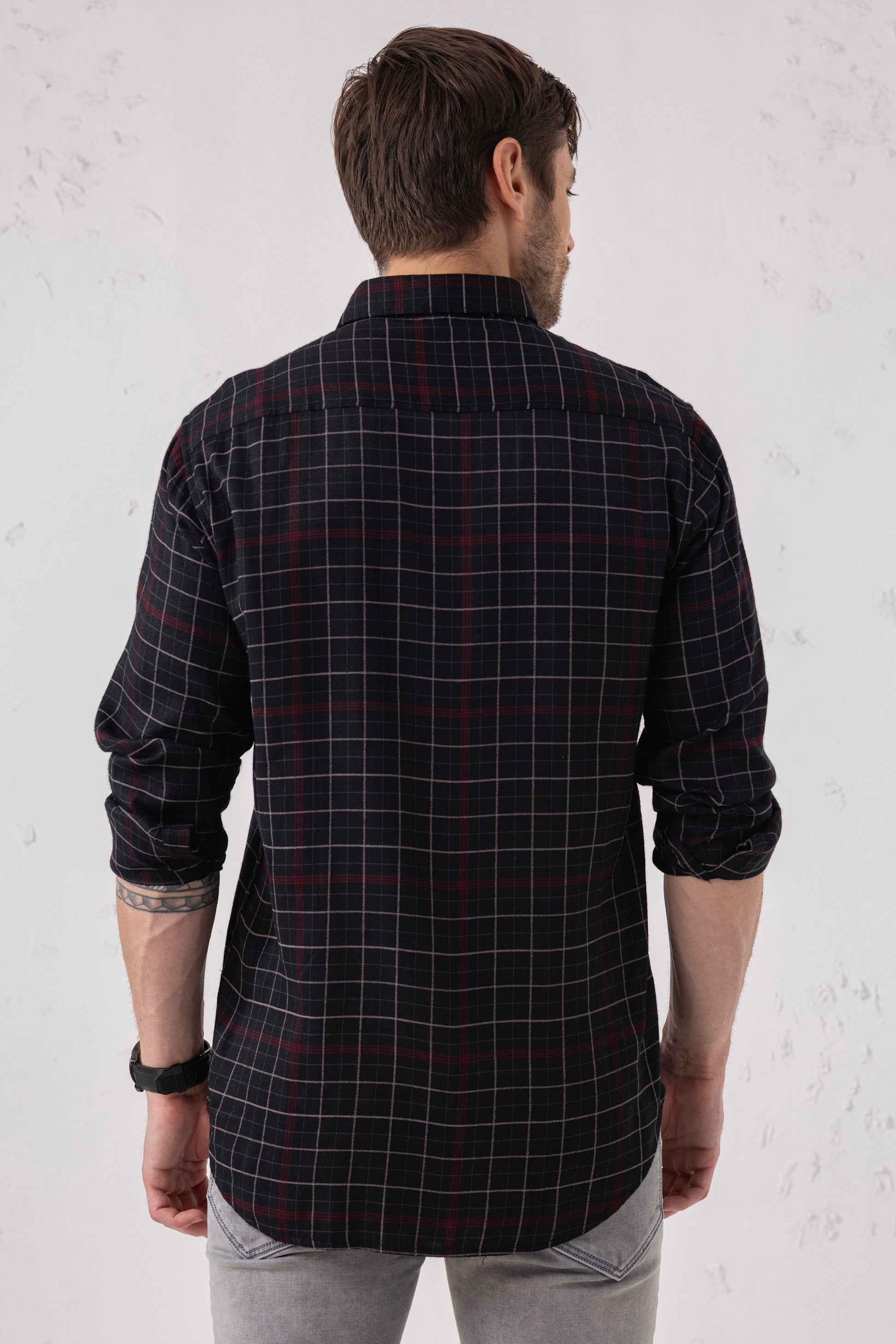 This shirt is a tribute to precision and pattern -where fine maroon lines intersect with black to form a classic yet bold grid. Crafted for men who appreciate structure with style, it's a versatile staple that brings depth to minimalism. Whether it's a boardroom meeting or weekend outing, this shirt adapts with understated confidence. Let your wardrobe speak volumes with quiet detail and sharp design - a timeless piece that never fades out of relevance.