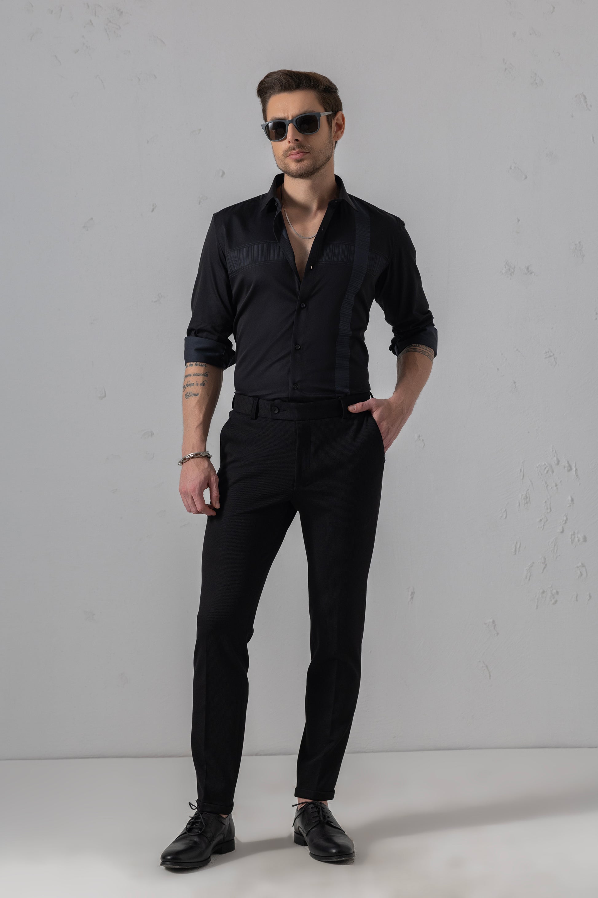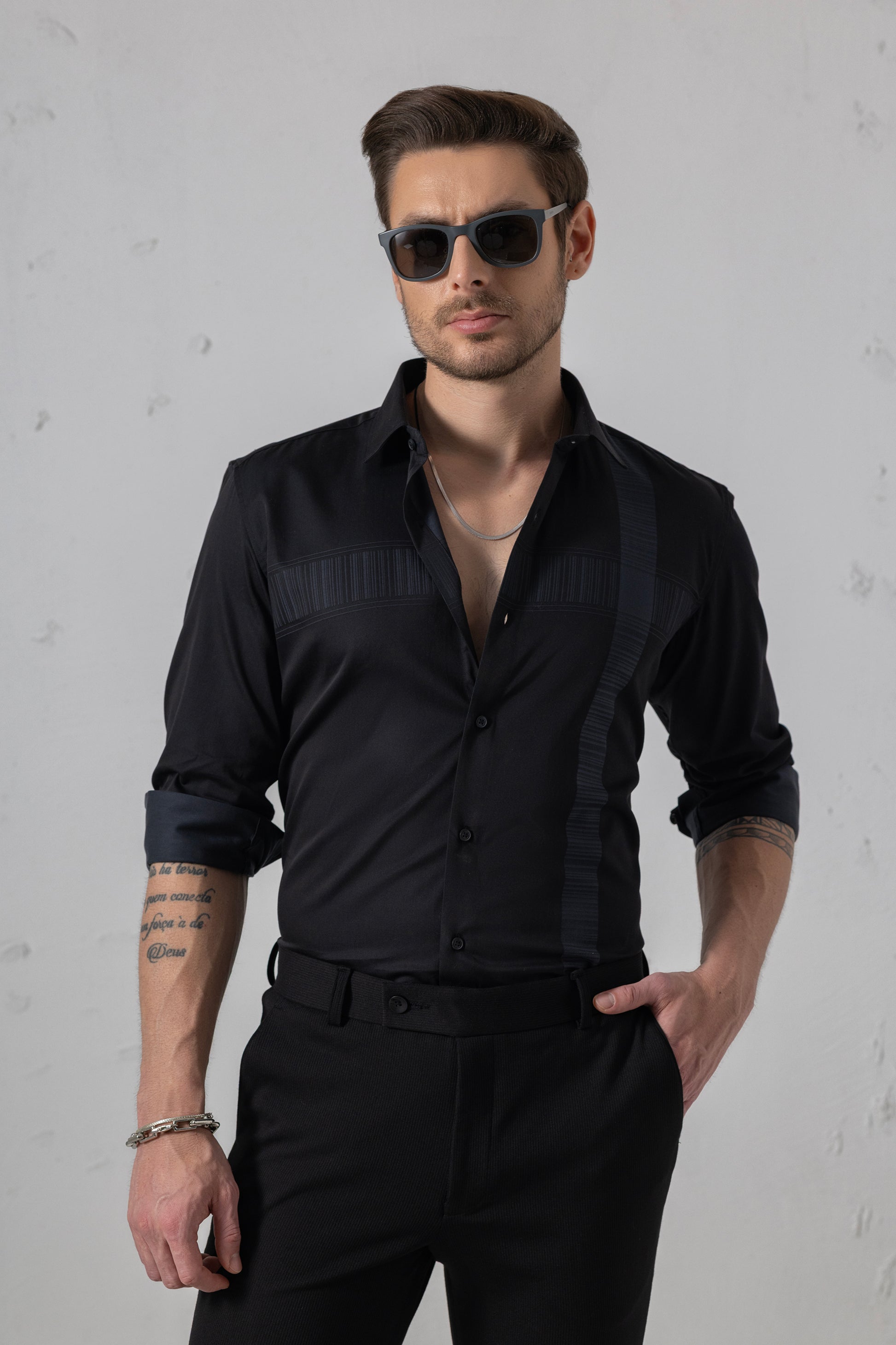 Urban Thing’s Textured Sophistication Black Flat Weave Panel Shirt combines 100% premium cotton with tonal textured panels for a refined, modern edge. Ideal for formal evenings and upscale casual looks. Vyne by Urban Thing.
