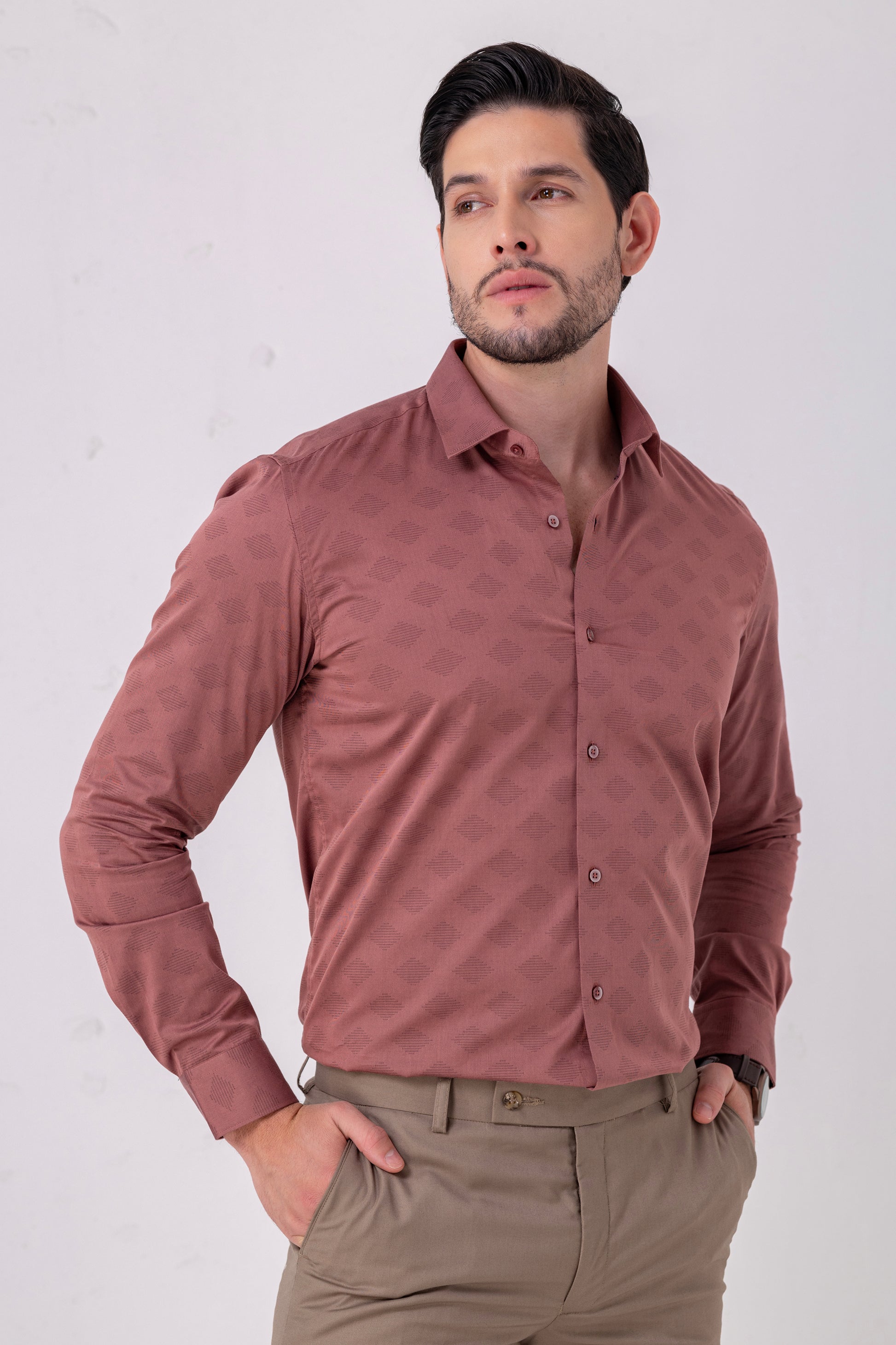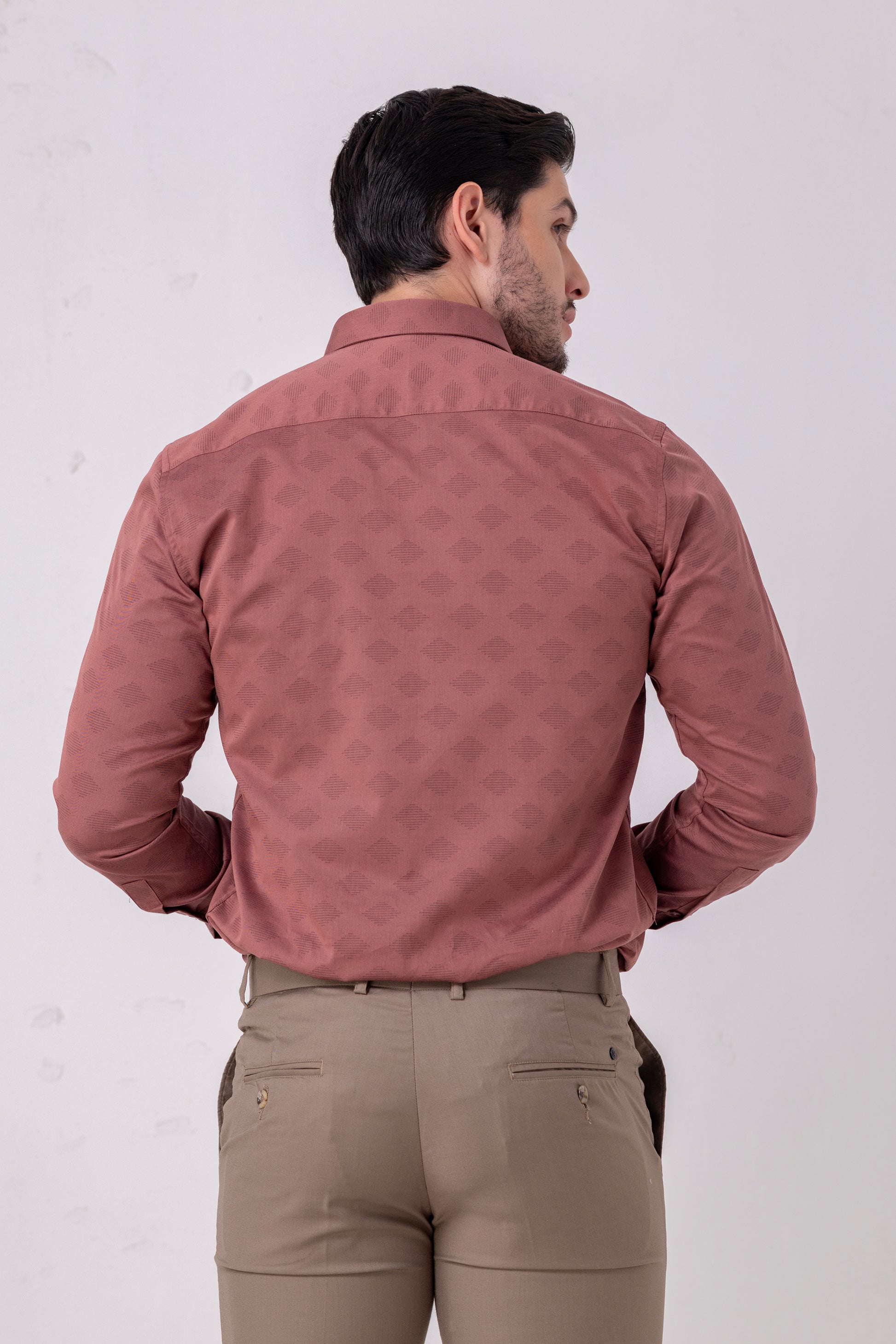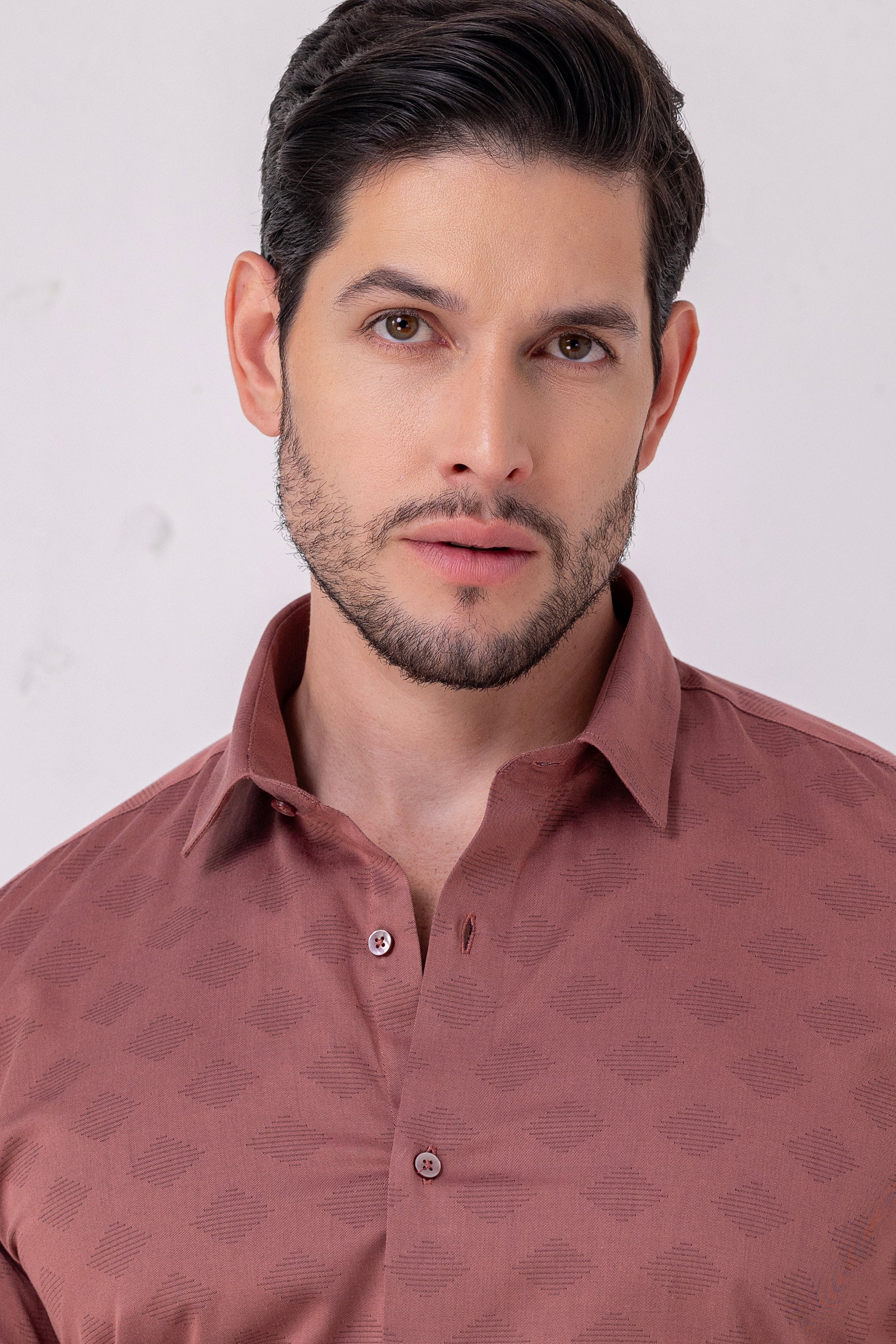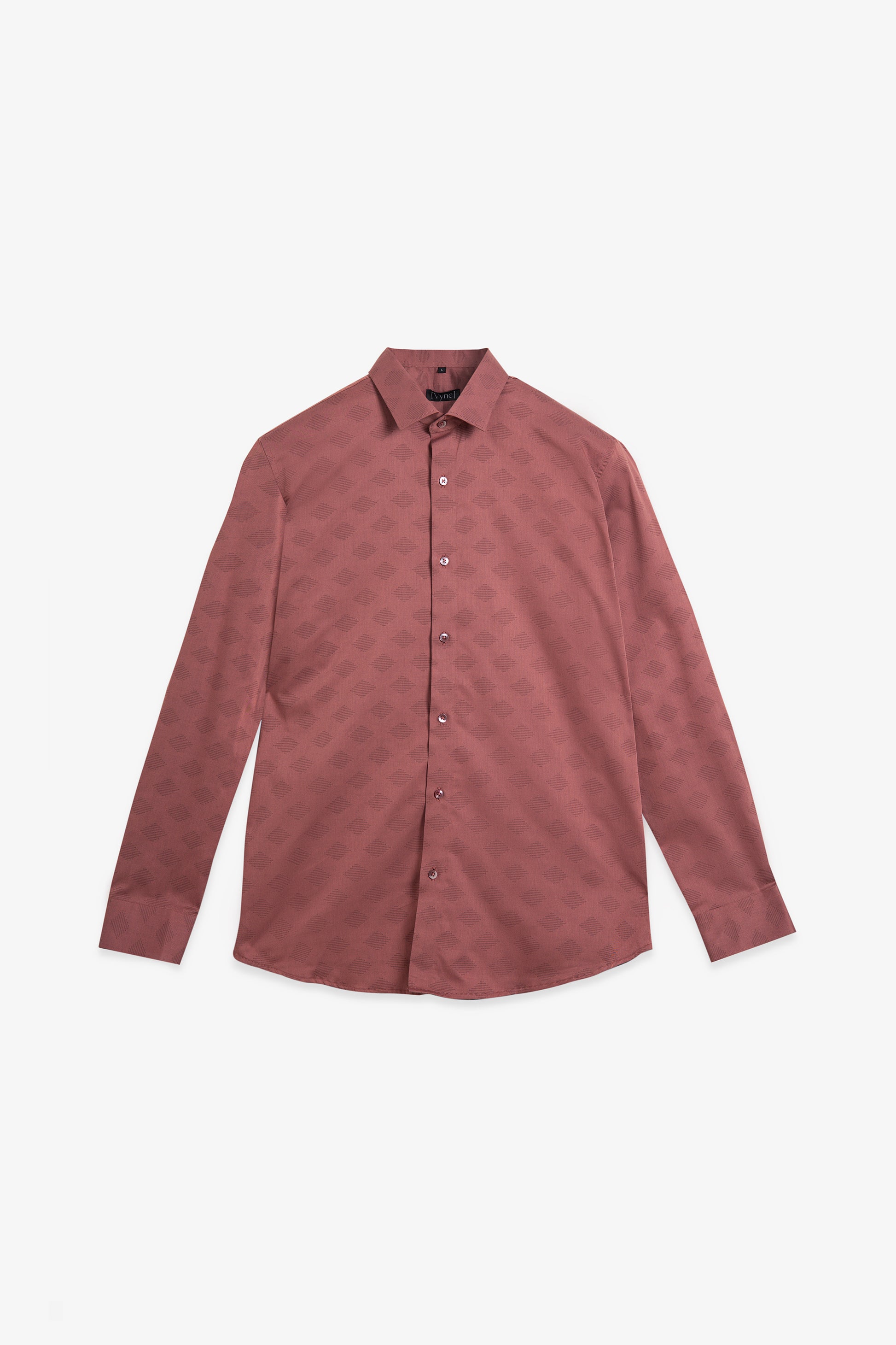 Coral Sophistication Jacquard Shirt is crafted from 100% premium cotton with an intricate jacquard weave. Its vibrant coral hue and breathable comfort make it perfect for modern office wear, creative meetings, and stylish weekend outings. Vyne by Urban Thing.