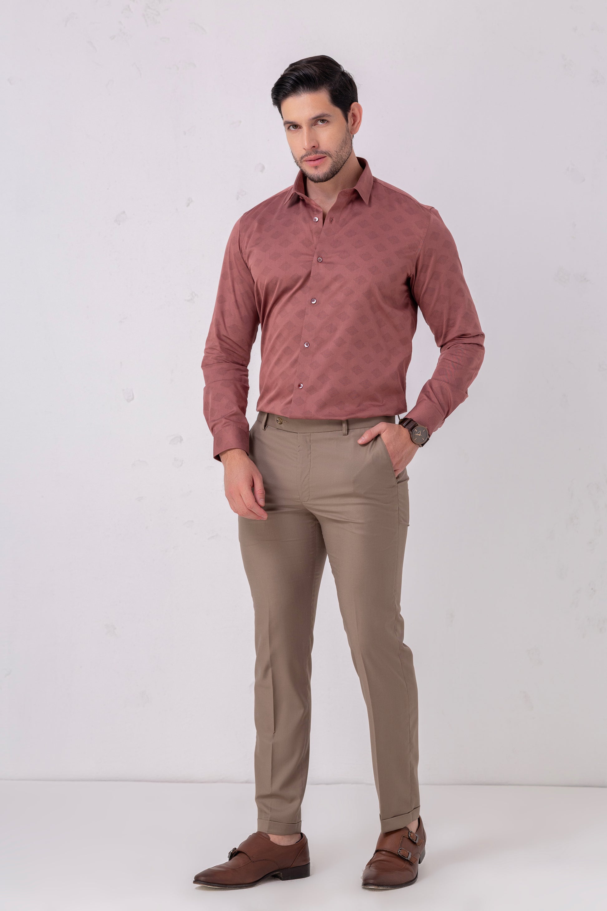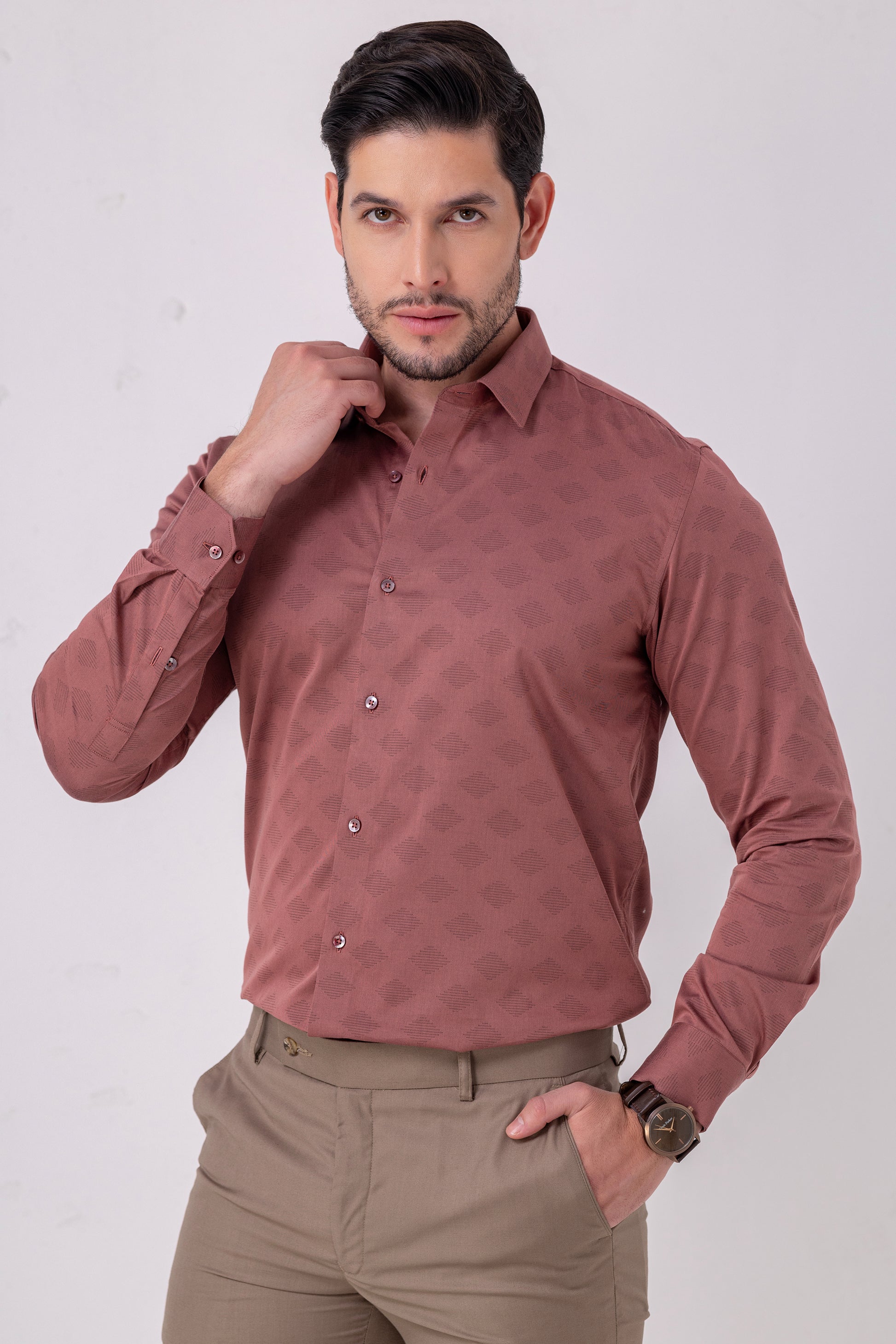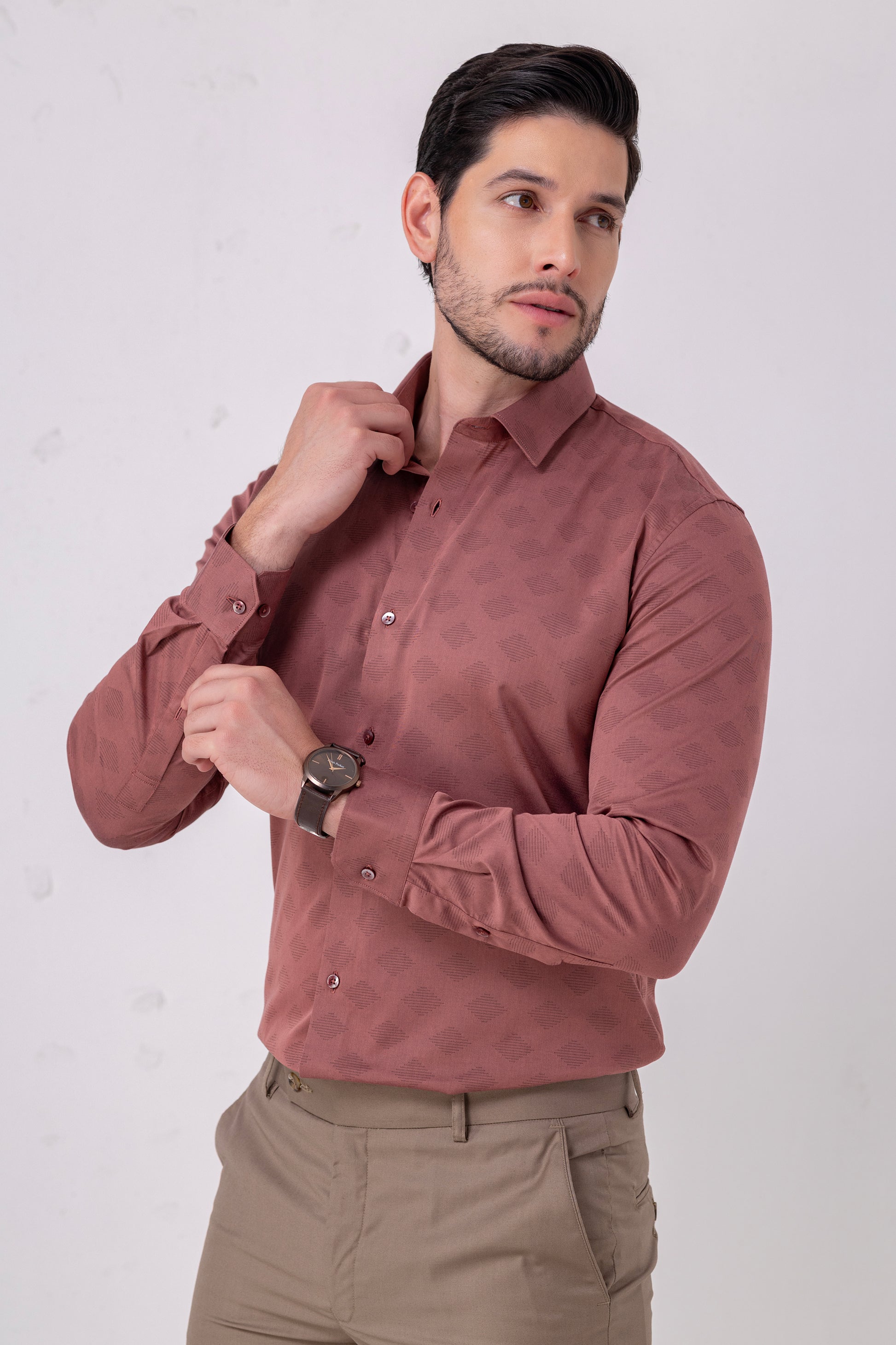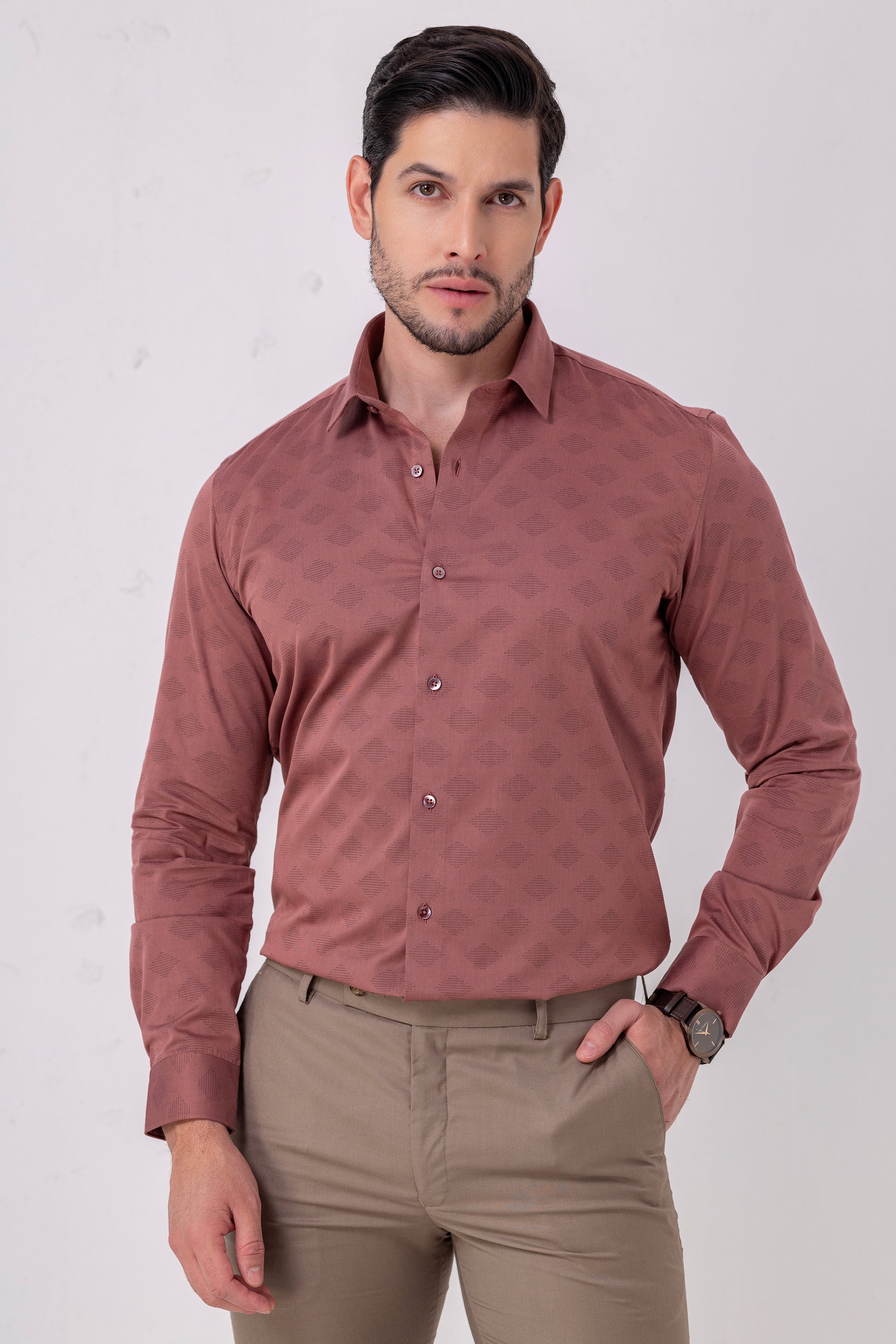 Coral Sophistication Jacquard Shirt is crafted from 100% premium cotton with an intricate jacquard weave. Its vibrant coral hue and breathable comfort make it perfect for modern office wear, creative meetings, and stylish weekend outings. Vyne by Urban Thing.